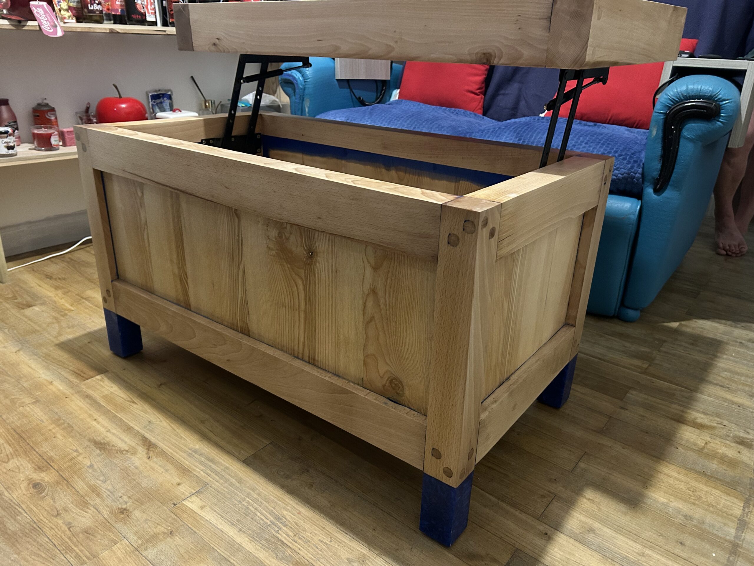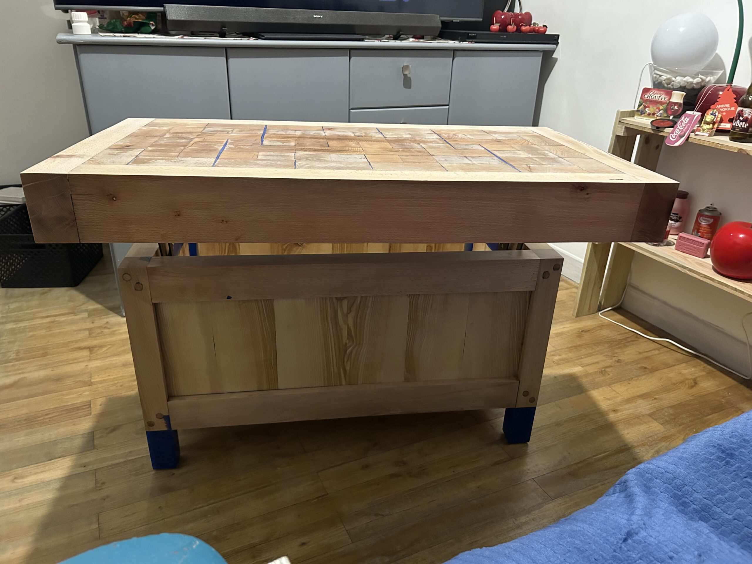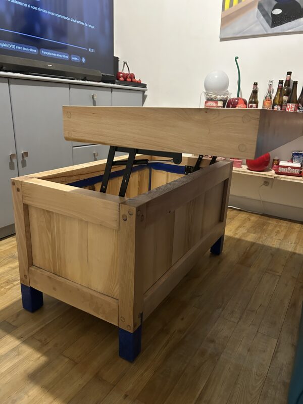Cette table basse artisanale est bien plus qu’un simple meuble : c’est une création unique alliant esthétique brute et ingénierie fonctionnelle. Fabriquée en bois massif soigneusement sélectionné, elle se distingue par son plateau en damier façon billot de boucher, offrant une surface robuste et élégante. Son système de plateau relevable, discret mais solide, dévoile un vaste espace de rangement intérieur idéal pour plaids, magazines ou accessoires du quotidien. Les pieds teintés d’un bleu profond apportent une touche contemporaine à cette pièce chaleureuse, idéale dans un salon moderne, rustique ou industriel.