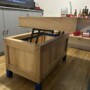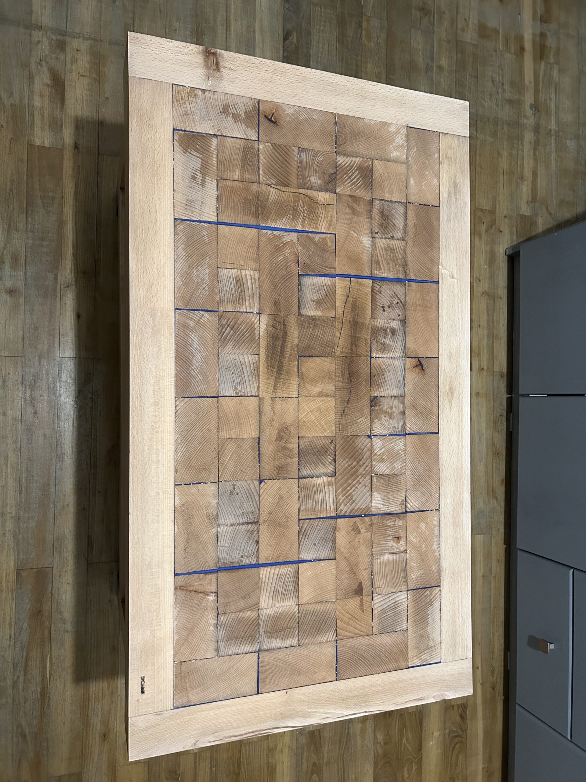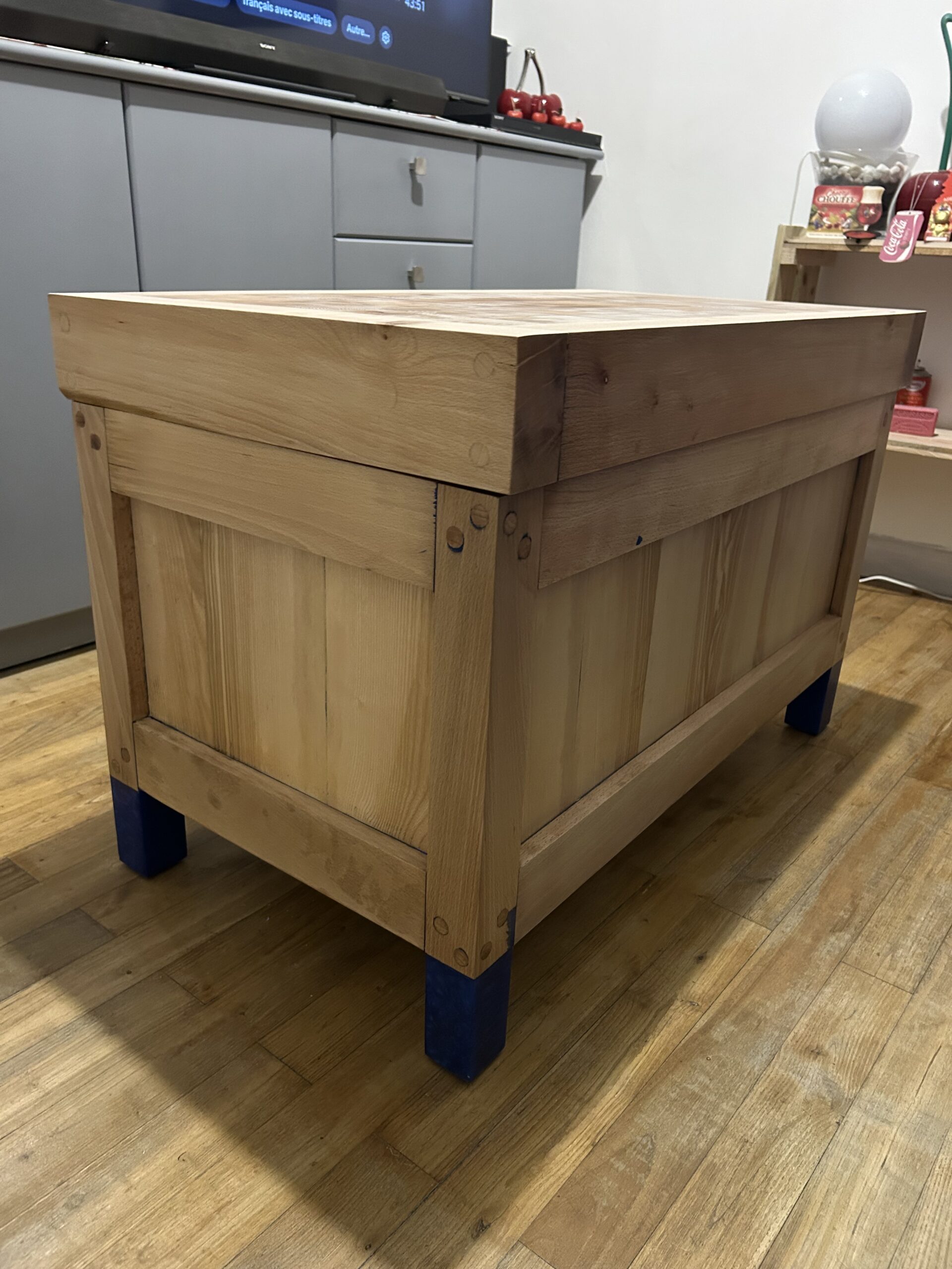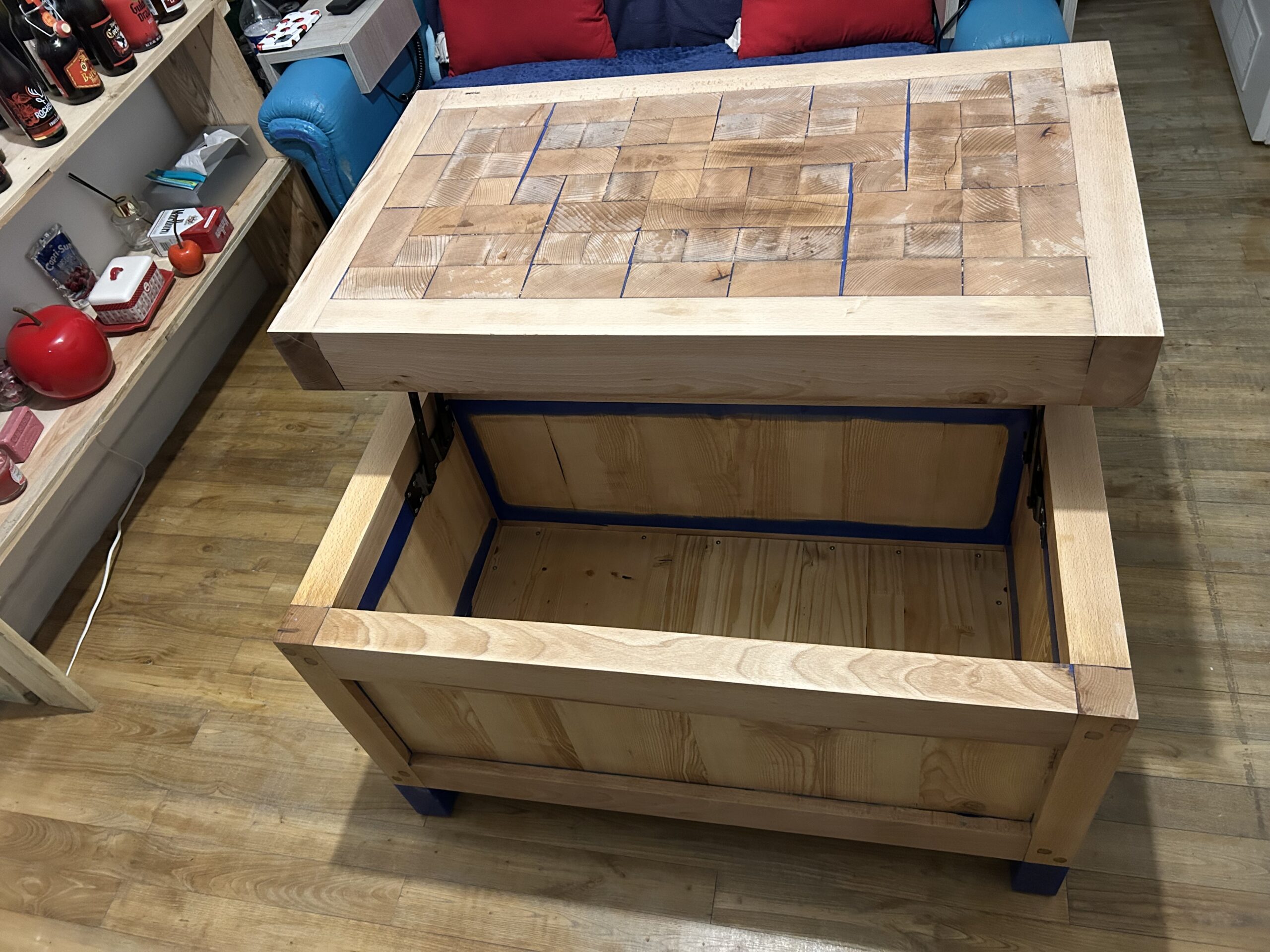 Cette table basse artisanale est bien plus qu’un simple meuble : c’est une création unique alliant esthétique brute et ingénierie fonctionnelle. Fabriquée en bois massif soigneusement sélectionné, elle se distingue par son plateau en damier façon billot de boucher, offrant une surface robuste et élégante. Son système de plateau relevable, discret mais solide, dévoile un vaste espace de rangement intérieur idéal pour plaids, magazines ou accessoires du quotidien. Les pieds teintés d’un bleu profond apportent une touche contemporaine à cette pièce chaleureuse, idéale dans un salon moderne, rustique ou industriel.